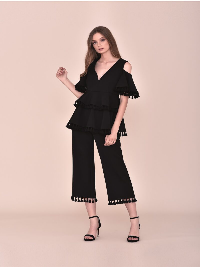 Traje negro pompones